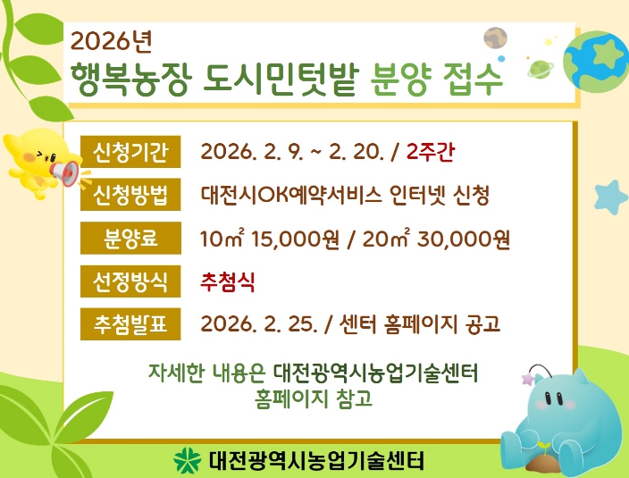 [뉴스다컴] 대전시농업기술센터는 도심속 농업․농촌 체험을 통한 도시농업 확산을 위해 2월 9일부터 대전시민을 대상으로 행복농장(도시민텃밭) 참가자 110세대를 모집한다.