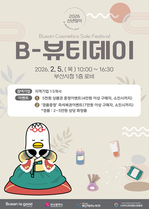 [뉴스다컴] 부산시는 오는 2월 5일 오전 10시부터 오후 4시 30분까지 시청 1층(대강당-대회의실 앞)에서 '2026 설맞이 비(B)-뷰티 데이'를 개최한다고 오늘(2일) 밝혔다.