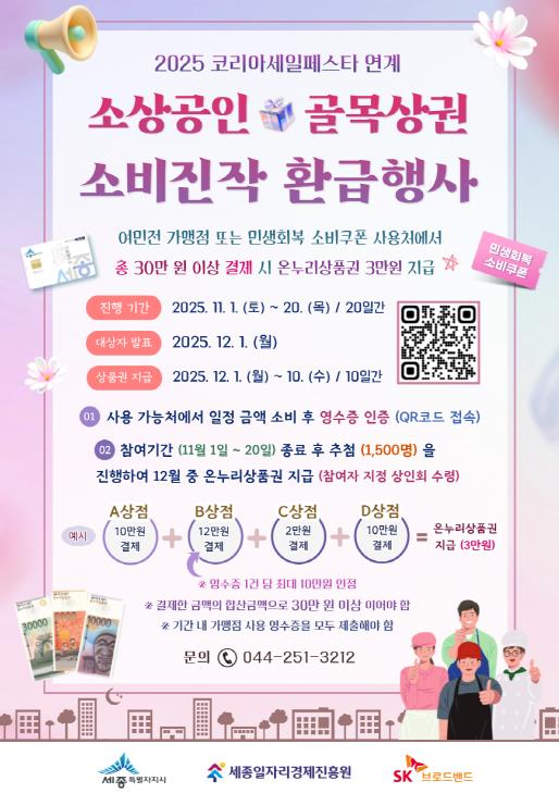 코리아 세일 페스타에서 이뤄지는 소비진작 환급행사는 30만 원 이상 결제한 영수증을 시 누리집이나 세종일자리경제진흥원에 게시된 홍보물의 정보무늬(QR)코드를 통해 인증하면 된다.