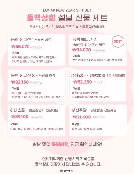 [뉴스다컴] 부산시와 부산경제진흥원은 부산 우수 제품 쇼핑 숍 '동백상회'에서 설 명절을 앞두고 지역기업 제품으로 구성된 '선물 세트'를 출시하고, 동백상회 제품 구매 고객 대상 사은품 증정 행사를 진행한다고 밝혔다.