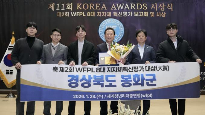 [뉴스다컴] 봉화군이 세계청년리더총연맹(WFPL) 부설 지자체혁신평가위원회(GEC)가 주관한 ‘제2회 WFPL 8대 지자체 혁신평가’에서 기관 부문 최고 영예인 ‘대상(大賞)’을 수상했다.