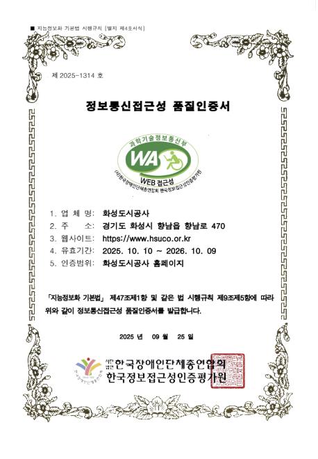 [뉴스다컴] 화성도시공사는 시각장애인, 고령자 등 정보 취약계층도 불편 없이 홈페이지를 이용할 수 있도록 지속적으로 개선해온 결과, 3년 연속 ‘웹 접근성 품질인증마크’를 획득했다고 10일 밝혔다.