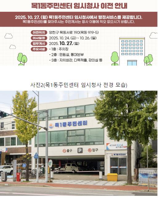 ▲ 목1동주민센터 임시청사 이전 안내문 |