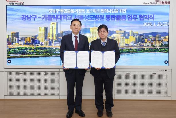 [뉴스다컴] 꿈이 모이는 도시, 미래를 그리는 강남구가 1월 23일 구청에서 가톨릭대학교 서울성모병원과 ‘강남구 통합돌봄 가정형 호스피스 협력사업’ 추진을 위한 업무협약(MOU)을 체결했다. 이 협약은 자치구와 상급종합병원이 연계해 가정형 호스피스를 지원하는 체계를 공식화했다는 점에서 그 의미가 크다.