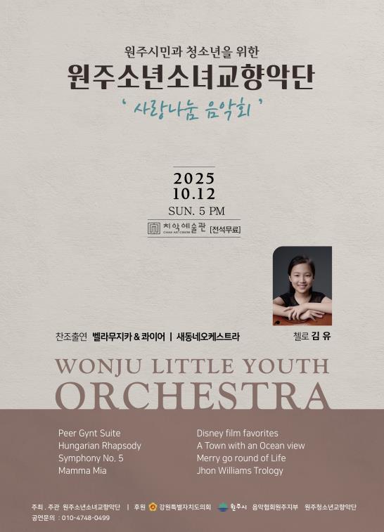 [뉴스다컴] 원주소년소녀교향악단은 오는 12일 오후 5시, 치악예술관에서 ‘사랑나눔음악회’를 통해 지역사회와 함께하는 따뜻한 무대를 마련한다.