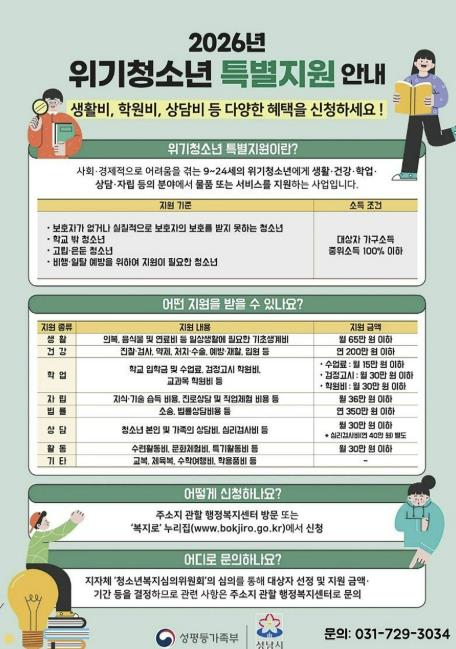 [뉴스다컴] 성남시는 위기 청소년의 생활, 학업 등을 돕기 위한 특별지원 사업을 시행한다고 3일 밝혔다.