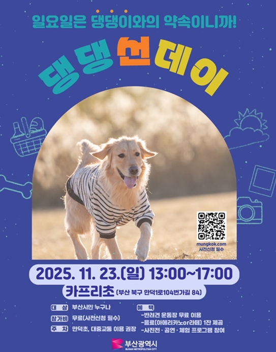 [뉴스다컴] 부산시는 오는 11월 23일 오후 1시부터 5시까지 카프리초(북구 만덕동 소재) 내 반려견 운동장에서 '댕댕 선데이(반려동물 동반 피크닉 체험 행사)'를 개최한다고 밝혔다.
