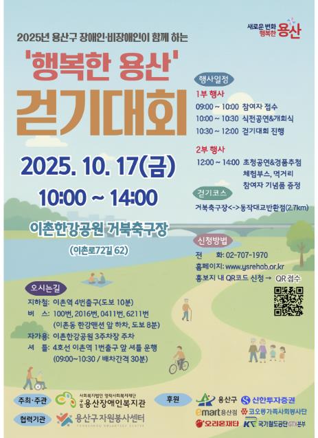 [뉴스다컴] 서울 용산구가 오는 17일 오전 10시 이촌한강공원 거북축구장 및 산책로 일대에서, 구립용산장애인복지관 주최로 열리는 ‘2025 장애인과 비장애인이 함께 하는 행복한 용산 걷기대회’를 후원한다.