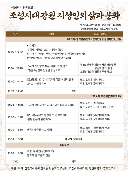 [뉴스다컴] 강원역사문화연구원 강원학연구센터는 2025년 10월 17일 오후 1시, 강원대학교 미래도서관 정강홀에서 제16회 강원학포럼 ‘조선시대 강원 지성인의 삶과 문화’를 조선시대사학회·강원대학교 국학연구소와 공동으로 개최한다.