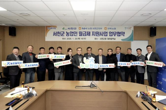 [뉴스다컴] 서천군은 지난 29일 NH농협 서천군지부 및 관내 6개 지역농협과 함께 농업인 월급제 지원사업의 원활한 추진을 위한 업무협약을 체결했다.