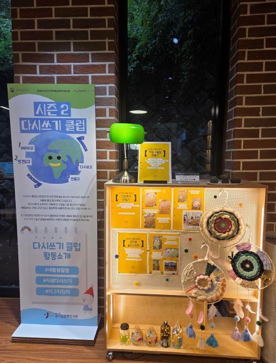 | ▲ ‘다시 쓰기 클럽 시즌 2’ 참여자들이 폐자원으로 만든 창작물을 손기정문화도서관 라운지에서 전시하고 있다. |