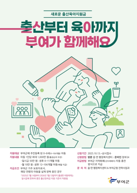 [뉴스다컴] 부여군이 저출산 위기에 대응하기 위해 기존 출산장려금 제도를 ‘출산육아지원금’으로 전면 개편하고, 오는 10월 13일부터 신청을 시작한다.