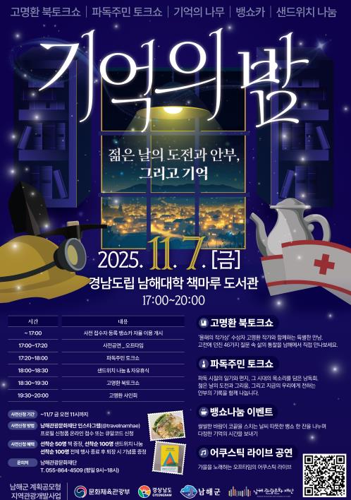 [뉴스다컴] ‘젊은 날의 도전과 안부, 그리고 기억’이라는 주제로 독일마을 기억의 밤 행사가 오는 11월 7일 17시부터 경남도립남해대학 책마루도서관에서 열린다.