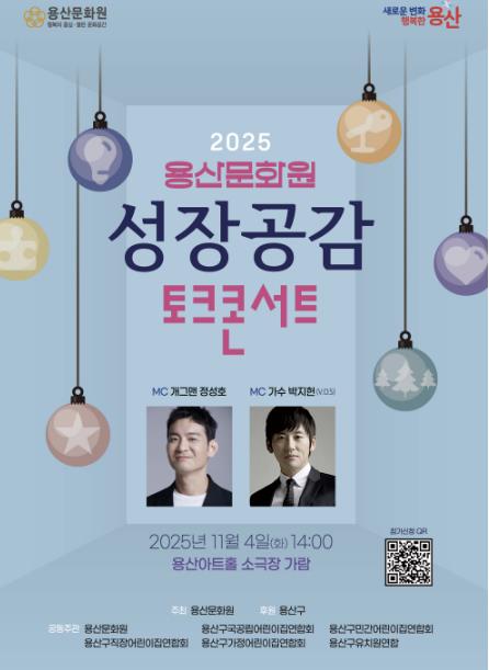 [뉴스다컴] 서울 용산구는 오는 11월 4일 오후 2시, 용산아트홀(녹사평대로 150) 소극장 가람에서 ‘성장공감 토크콘서트’를 개최한다. 이번 행사는 용산문화원이 주관하고 용산구가 후원한다.