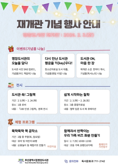부산광역시립명장도서관(관장 조수금)은 재개관을 기념해 2월 한 달간 시민과 함께하는 전시·체험·이벤트 프로그램을 운영한다.