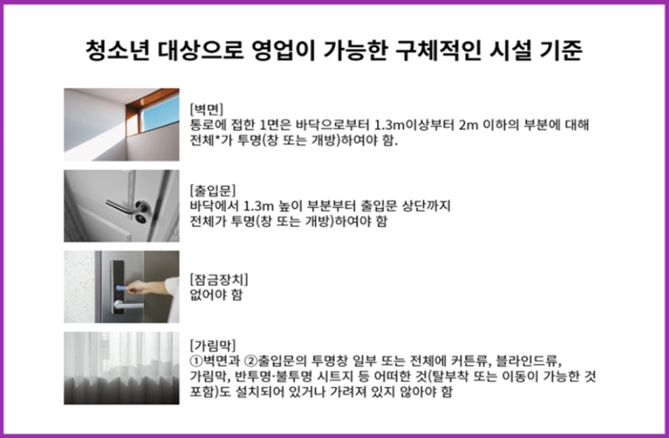 | ▲ 시설 기준(청소년 출입·고용금지업소 결정 고시)(2023-25호 요약/출처: 성평등가족부 블로그) |