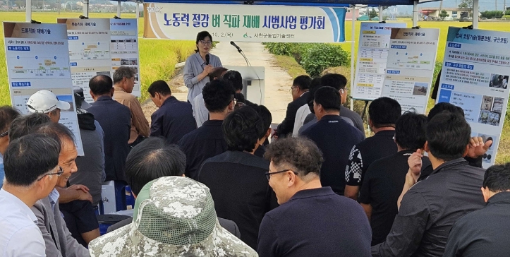 [뉴스다컴] 서천군농업기술센터는 지난 2일 서천군 화양면 고마리 일원에서 벼농사 생력화와 저탄소 농업실천 확대를 위한 ‘벼 직파재배 현장 평가회’를 개최했다.