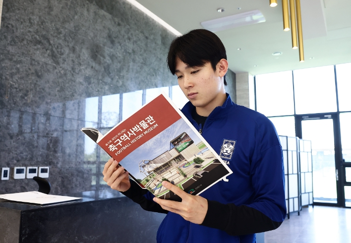 ▲ 천안 대한민국 축구종합센터에 소집된 국가대표 양민혁 선수가 축구역사박물관 홍보 자료를 읽고 있다.