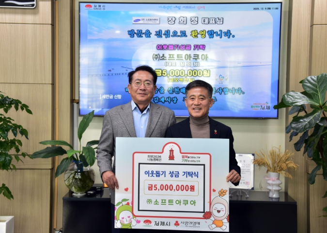 [뉴스다컴] 김제시는 (주)소프트아쿠아(대표 장희정)가 지난 9일 관내 취약계층을 돕기 위한 성금 500만원을 기탁했다고 밝혔다.