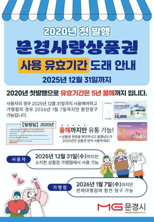[뉴스다컴] 문경시는 2020년 발행된 문경사랑상품권 유효기간이 2025년 12월 31일 종료됨에 따라 상품권을 기한 내 사용 및 환전하도록 권했다.
