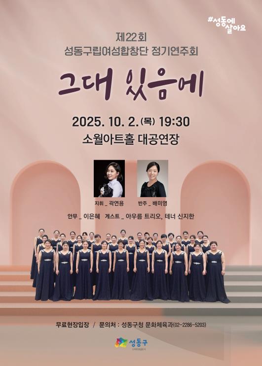 [뉴스다컴] 서울 성동구는 오는 10월 2일 저녁 7시 30분 소월아트홀에서 성동구립 여성합창단 '제22회 정기 공연'을 개최한다고 밝혔다. 공연 부제는 '그대 있음에'로 가을밤, 구민들에게 사랑과 위로의 하모니를 선사할 예정이다.