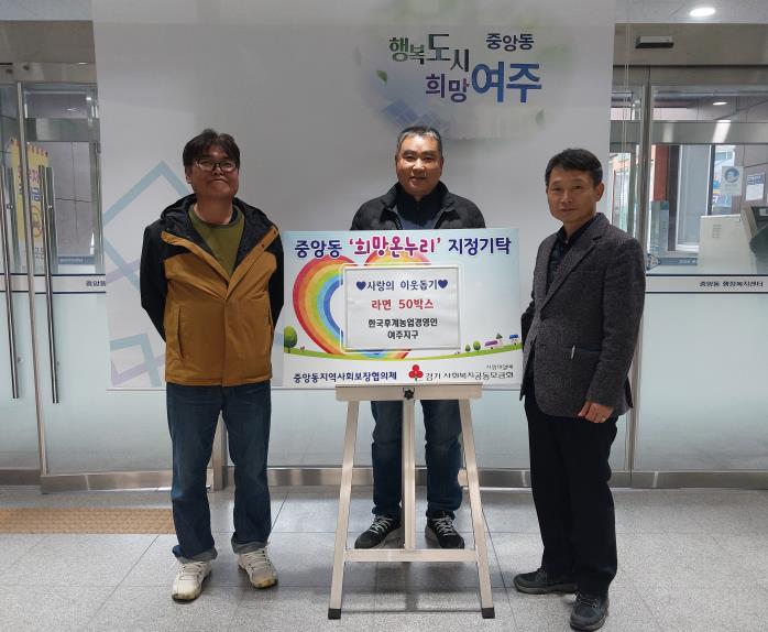[뉴스다컴] 여주시 중앙동 소재 한국후계농업경영인 여주지구은 지난 24일 동 행정복지센터를 방문해 관내 저소득 취약계층을 위한 라면 50박스를 기탁했다.