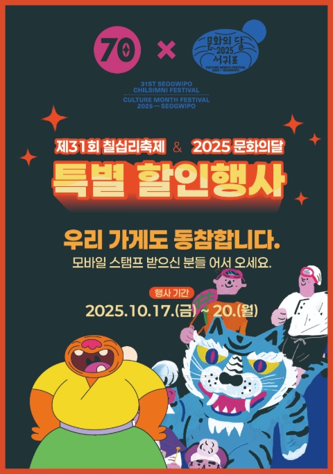 [뉴스다컴] 서귀포시는 ‘제31회 서귀포칠십리축제 & 2025 문화의달 행사’를 맞아 지역 상권 활성화를 위한 다양한 연계 이벤트를 운영한다고 밝혔다.