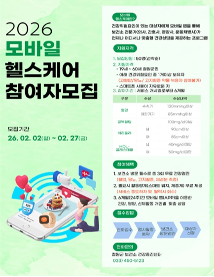 [뉴스다컴] 철원군보건소는 군민의 건강증진과 만성질환 예방을 위해 스마트폰 앱을 활용한 맞춤형 건강관리 서비스인 ‘모바일 헬스케어 사업’ 참여자 50명을 선착순으로 모집한다.