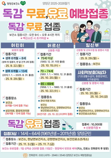 [뉴스다컴] 양양군이 2025년 9월 22일부터 어린이를 시작으로 임신부, 어르신 대상 인플루엔자 무료 예방접종을 실시한다.