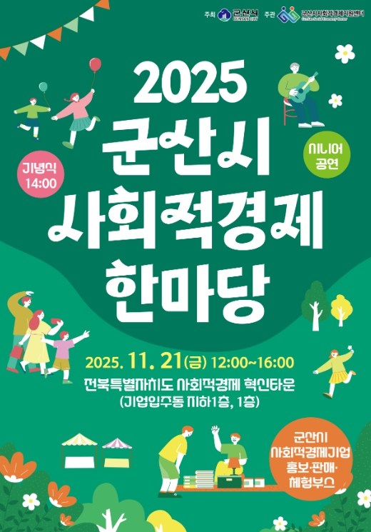 [뉴스다컴] 군산시가 21일, 전북특별자치도 사회적경제 혁신타운(군산시 대학로 600)에서 ‘2025 군산시 사회적경제 한마당’을 개최한다.