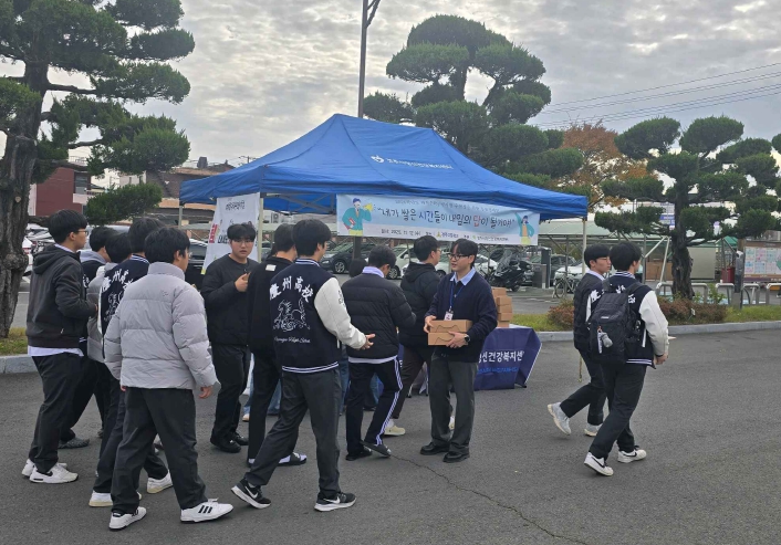 | ▲ 경주시정신건강복지센터가 12일 경주고등학교 앞에서 2026학년도 수능을 앞둔 고3 수험생들에게 힐링키트를 전달하며 응원 메시지를 전하고 있다 |