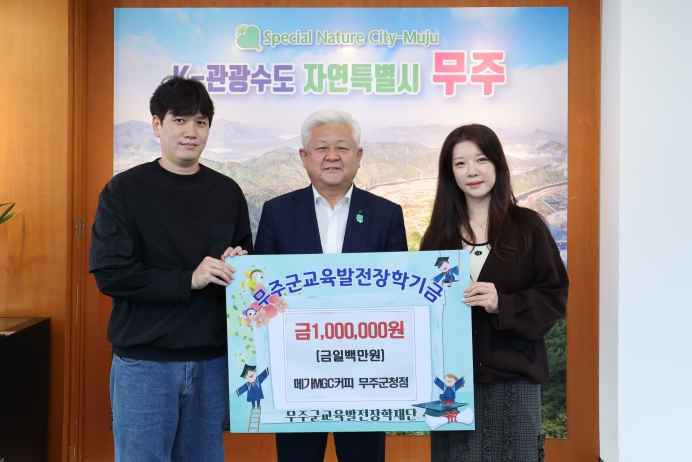 [뉴스다컴] 메가MGC커피 무주군청점에서 지난 23일 (재)무주군교육발전장학재단(이사장 황인홍 무주군수)에 장학금 1백만 원을 기탁했다.