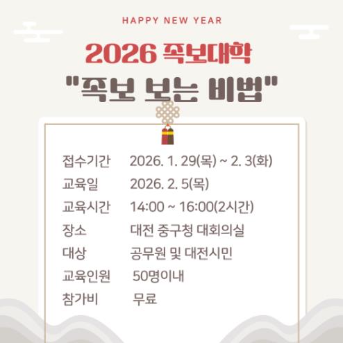 이번 교육은 오는 2월 5일 오후 2시부터 4시까지 중구청 대회의실에서 대전 시민 및 공무원 50명을 대상으로 무료로 진행된다.