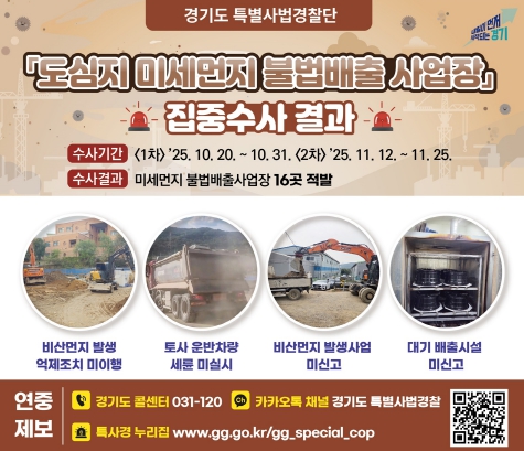 [뉴스다컴] 경기도는 도심지 미세먼지 발생사업장 330개를 대상으로 불법 배출 행위를 집중 수사해 대기환경보전법 위반 사업장 16개를 적발했다고 9일 밝혔다.
