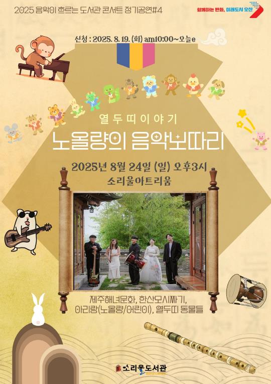 [뉴스다컴] 오산시 소리울도서관은 오는 8월 24일 오후 3시, 소리울아트리움에서 『2025 음악이 흐르는 도서관 콘서트 정기공연 #4 – 노올량의 음악보따리』를 개최한다고 밝혔다.