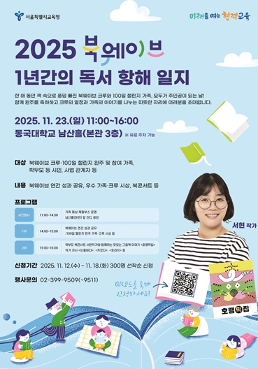 [뉴스다컴] 서울특별시교육청은 오는 11월 23일(일) 동국대학교 남산홀에서 가족독서 캠페인 '온 가족 북웨이브'의 1년 여정을 돌아보는'2025 북웨이브, 1년간의 독서 항해일지'를 개최한다. 이번 행사는 북웨이브 100일 챌린지 완주 가족, 북웨이브크루, 학생·시민이 함께 참여하는 서울시교육청 대표 독서문화 축제다.
