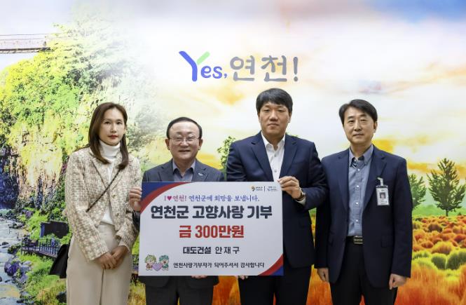 [뉴스다컴] 연천군은 11월 3일 군수실에서 고향사랑기부제 기탁식을 열고, (주)대도건설 안재구 대표로부터 300만 원의 고향사랑기부금을 전달받았다고 밝혔다.