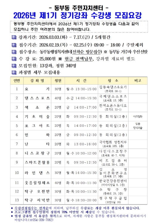 | ▲ 2026년 동부동 주민자치센터 제1기 정기강좌 수강생 모집요강 |