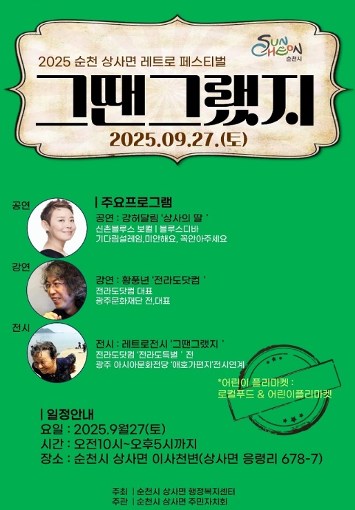 [뉴스다컴] 순천시 상사면오는 27일 오전 10시부터 오후 5시까지 상사면 이사천 일대(상사파크골프장 내, 응령리 687-7번지)에서 '2025 상사면 레트로 페스티벌-그땐 그랬지'를 개최한다고 밝혔다.