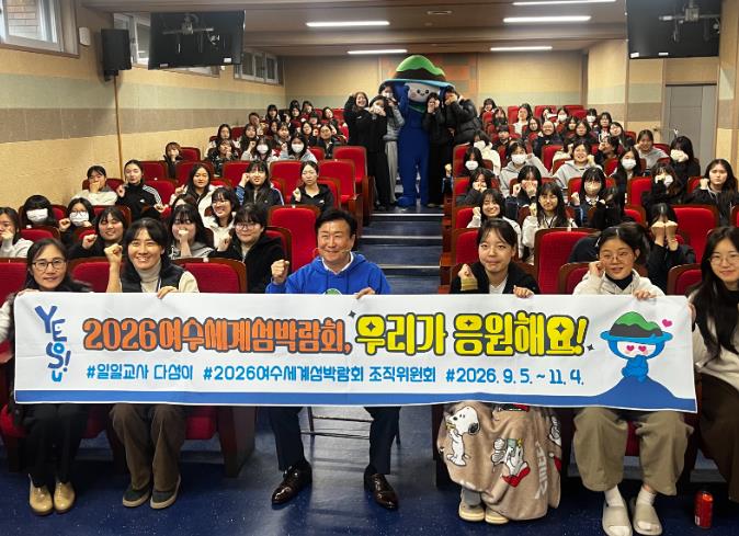 [뉴스다컴] (재)2026여수세계섬박람회 조직위원장 정기명 여수시장이 섬박람회를 알리기 위해 여수 중앙여자고등학교에 일일교사 다섬이로 나섰다.
