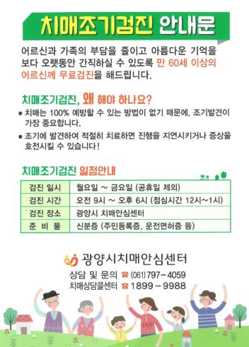 치매검사 및 검사비 지원과 관련한 자세한 사항은 광양시치매안심센터로 문의하면 안내받을 수 있다.