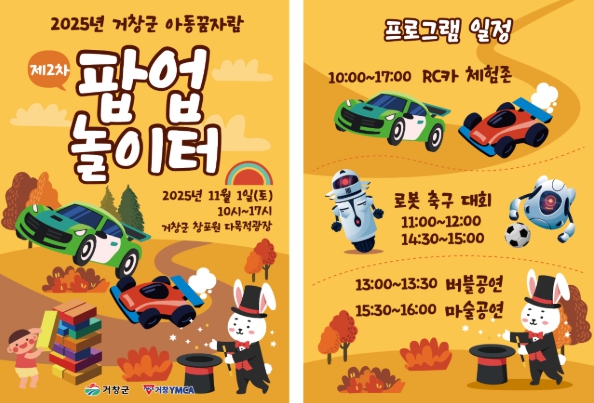 [뉴스다컴] 거창군은 오는 11월 1일, 오전 10시부터 오후 5시까지 남상면 창포원에서 ‘아동꿈자람 팝업놀이터’ 행사를 운영할 예정이다. 이번 행사는 지난 7월 수승대 잔디광장에서 열린 행사에 이어 두 번째로 마련된 것으로, 거창군 국화축제 기간 중 열리며 아이들이 자유롭고 안전하게 즐길 수 있는 체험형 놀이공간을 제공한다.