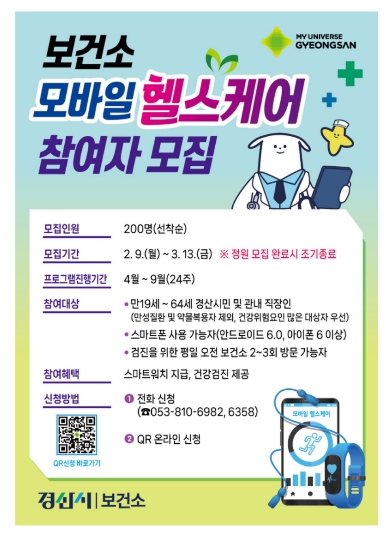 [뉴스다컴] 경산시는 ICT 기술을 활용해 시민의 생활 습관을 개선하는‘2026년 모바일 헬스케어 사업’ 참여자 200명을 오는 9일부터 모집한다고 밝혔다.