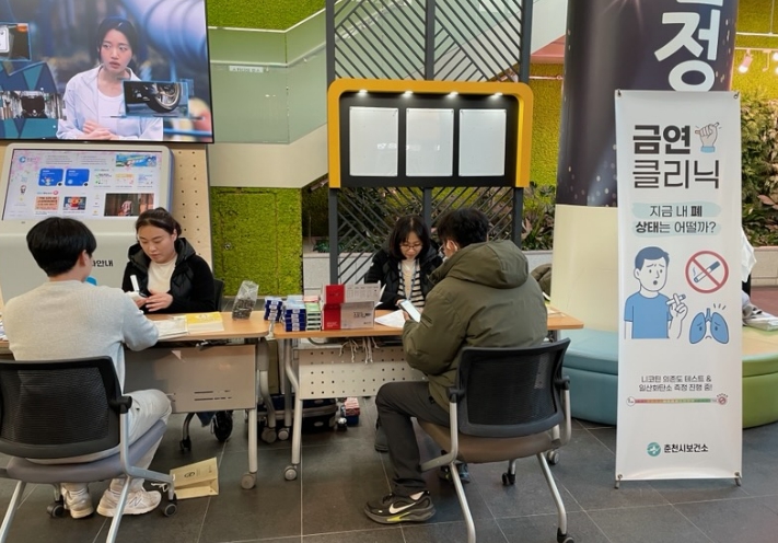 시는 4일 춘천시청 1층 로비에서 시청 방문객과 직원들을 대상으로 올해 첫 이동 금연클리닉을 진행했다. 이날 클리닉은 전문 상담사와의 금연상담과 일산화탄소 측정과 니코틴 의존도 검사 등이 진행됐다. 심뇌혈관질환 예방관리를 위해 혈압·혈당 측정도 함께 진행됐다.