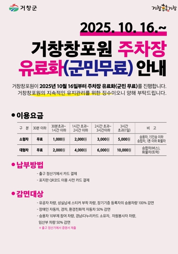 이번 조치는 '거창군 거창창포원 지방정원 관리 및 운영 조례'에 따른 것으로, 거창군민을 제외한 외부방문객 차량을 대상으로 주차요금을 징수할 계획이다.