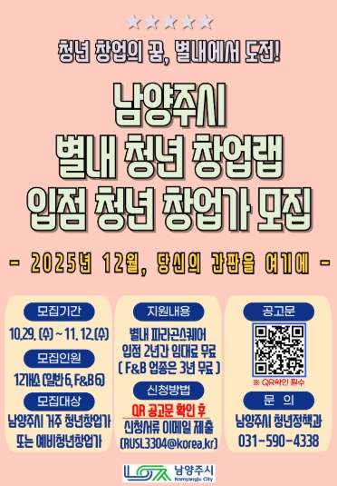 [뉴스다컴] 남양주시는 29일부터 청년 창업가들을 위한 ‘남양주시 별내 청년 창업랩’ 입점자를 공개 모집한다.