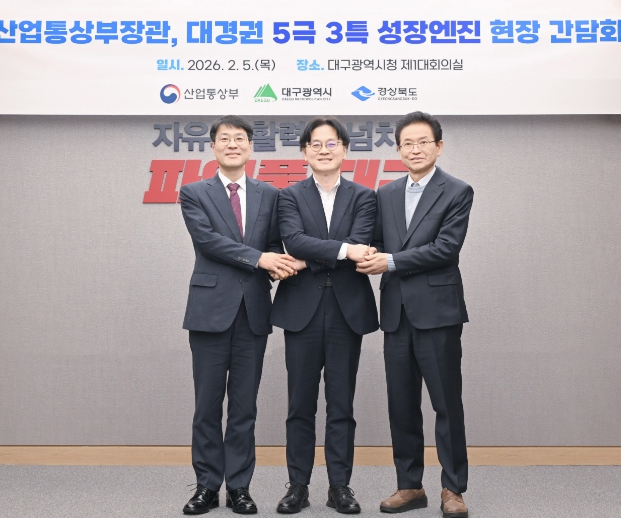 [뉴스다컴] 대구광역시는 2월 5일 대구광역시청 산격청사에서 김정관 산업통상부 장관 주재로 ‘대경권 5극 3특 성장엔진 전략산업 현장간담회’를 개최했다고 밝혔다.