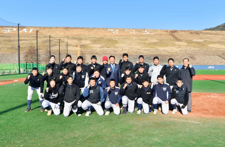 | ▲ 김한종 장성군수가 27일 원주고 야구 선수단이 동계 전지훈련 중인 장성호 체육공원을 찾았다. |