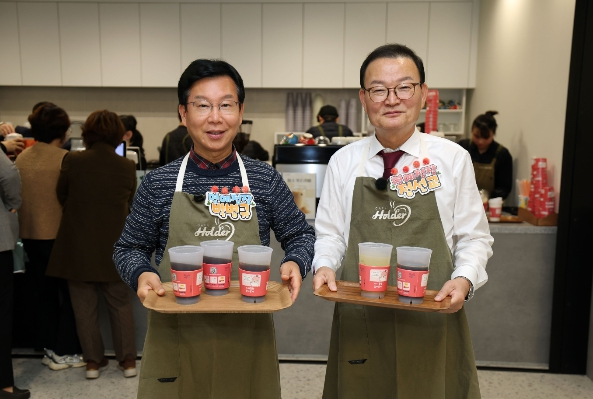 [뉴스다컴] 박병규 광산구청장과 정선교 대명외식산업 대표가 27일 광산구청 1층 모두의 쉼터 조성을 기념해 청각장애인의 자립을 돕는 일터인 구청 내 ‘카페홀더’에서 일일 명예점장 사회공헌활동을 진행했다.