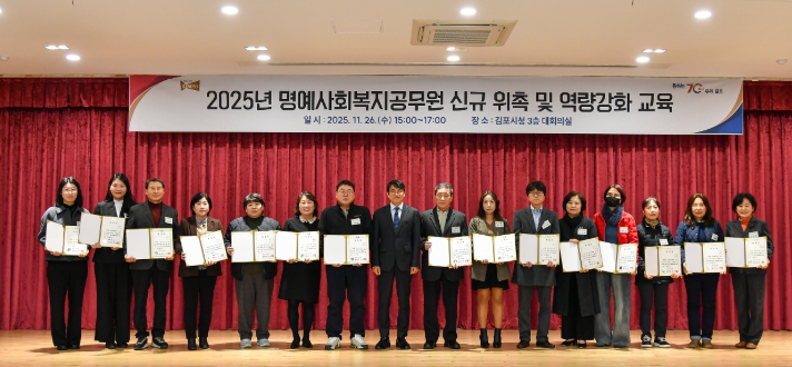 [뉴스다컴] 김포시는 지난 26일 통·리장과 지역사회보장협의체 위원 등 지역 주민 181명을 신규 명예사회복지공무원으로 위촉했다. 이 중 대표 15명에게 위촉장을 수여했으며, 약 100명을 대상으로 역량 강화 교육도 함께 진행했다.